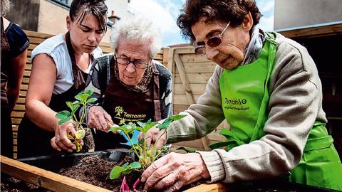Dans le jardin de l'unité de vie protégée de la maison de retraite Saint-Rémy, à Nancy, les résidents plantent des fruits et des légumes dans des jardinières situées en hauteur. PHOTO : ANTOINE LABREUCHE