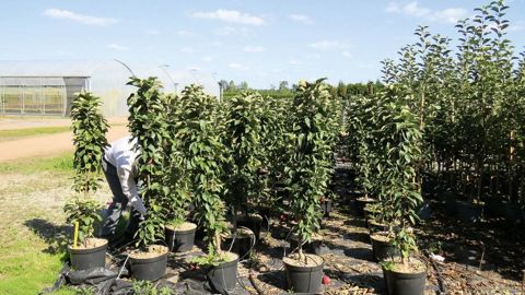 La pépinière Georges Delbard développe depuis une quinzaine d'années une gamme d'arbres fruitiers destinés aux balcons et aux terrasses en très gros pots. Ici, la variété 'Villandry'.