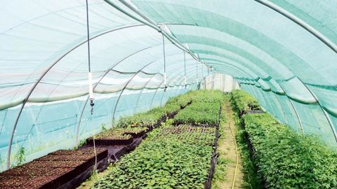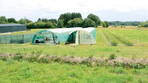 Vue d'ensemble de la pépinière Graine de Bocage, à Théhillac, avec un espace hors-sol extérieur (à gauche, derrière le coupe-vent), deux serres avec voiles d'ombrage pour le naissage, et un espace pleine terre (à droite) pour la seconde année d'élevage. GRAINE DE BOCAGE