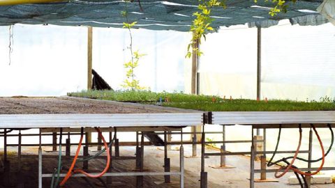 Une zone sous fog system convient pour la majorité des boutures mais il a fallu investir dans des tablettes avec aquanappes pour les vivaces à feuillage gris qui pourrissaient sous fog.