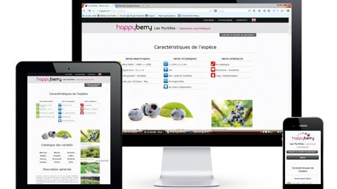 Première étape importante liée à ce nouveau mode de vente, une réflexion sur le calibrage des plantes, afin d'optimiser le conditionnement et les expéditions. Selon les espèces et variétés, les formats proposés vont de la racine nue au pot de 1,3 l ou 1,6 l, parfois 2 l ou 4 l pour certaines variétés. « Dès le départ, nous avons compris que pour nous faire une place sur ce marché concurrentiel de la vente en ligne, nous devions nous démarquer avec un site qui soit différent de ce que les autres acteurs proposaient. Nous avons donc créé une marque commerciale, happyberry, un nom simple à retenir, joyeux et facilement compréhensible pour tous, y compris pour les acheteurs étrangers. Le site Internet consacré aux petits fruits est distinct de celui des Pépinières de la Demoiselle et est identifié sous cette marque. Nous avons choisi d'y développer deux volets : un pour les professionnels qui représentent actuellement 80 % de nos acheteurs (producteurs de petits fruits) et un pour les amateurs. Cependant, ces derniers ont accès aux données professionnelles s'ils le souhaitent. Pour l'ensemble, nous avons adopté pour une stratégie globale avec une mise en forme soignée et moderne, des photos de grande qualité et des informations que l'on ne trouve pas ailleurs, comme par exemple le taux de sucre de l'espèce ou son pouvoir antioxydant. Le site n'a pas été conçu comme un simple catalogue en ligne, mais davantage comme un portail d'entrée informatif sur les petits fruits. Nous y détaillons un grand nombre d'informations sur les espèces que nous commercialisons, sur les travaux de recherche récents, etc... Le catalogue papier, les chromos ont été également travaillés dans un esprit de cohérence d'ensemble. »