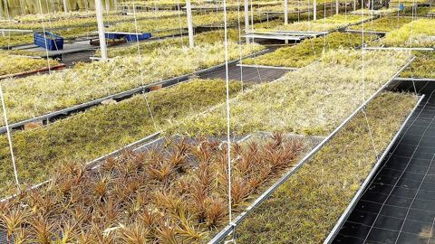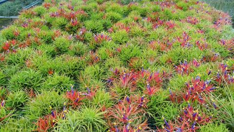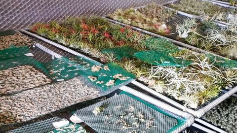 Les graines sont mises à germer puis les plantules passent sur tulle plastique (moustiquaire) pendant un an. Ensuite, lesTillandsiareposent sur des cadres munis de grilles en métal outendus de filets à olives selon les espèces. PHOTO :TILLANDISA PROD