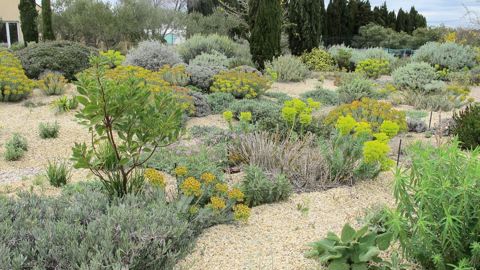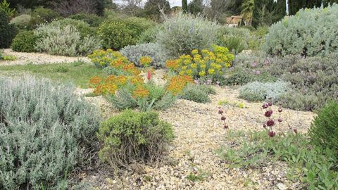 - Le jardin de démonstration, ouvert sur rendez-vous, permet d'étudier les plantes, leur comportement. Coussins végétaux, couvre-sols tapissants, arbustes créent des strates de hauteurs et de formes différentes en un mini-paysage vallonné sillonné d'allées. Le terrain argileux ne convenant pas, le pépiniériste a créé des buttes et des chemins favorisant le drainage. La faible densité de plantation permet à chaque végétal de s'exprimer et offre l'opportunité aux jeunes pousses de se développer. Cette dynamique naturelle est augmentée par le paillage minéral, qui renforce l'espèce plantée en recréant son milieu d'origine (caillouteux) tout en limitant les adventices traditionnelles. Par exemple, dans le jardin d'Olivier Filippi, un seul pied d'Euphorbia rigida et un seul pied d'Euphorbia characias ont été installés : tous les autres individus sont arrivés par semis. Le travail du jardinier consiste alors non plus à planter, mais à arracher ici et là les sujets dont il ne veut pas et à laisser se développer les autres. « Cette approche libère le potentiel créatif du jardinier amateur, puisque le paysage se construit année après année, au fur et à mesure de son évolution. » Ainsi, non seulement le jardin méditerranéen permet de s'affranchir de l'arrosage et des opérations d'entretien habituelles, mais en plus il rassure face à la peur de l'échec celui qui y travaille et s'en occupe.