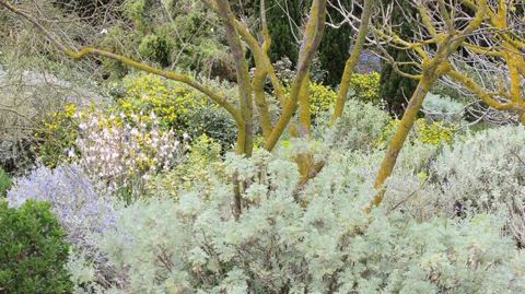 - Pour avoir un jardin à entretien réduit, il faut d'abord diminuer l'arrosage, ce qui limite la présence des herbes indésirables. « En Méditerranée, les adventices germent au printemps et à l'automne en présence d'eau. Quand il n'y a pas d'eau, nous constatons qu'elles se développent beaucoup moins. » Le paillage minéral qui reproduit les conditions de développement des plantes méditerranéennes en terrain caillouteux freine également la croissance des indésirables. L'emploi de plantes à feuillage persistant permet d'établir une concurrence pour la lumière. Un quatrième paramètre permet de limiter les adventices : l'usage de plantes allélopathiques (*). Dans sa recherche d'un jardin à entretien réduit, Olivier Filippi s'y intéresse depuis une dizaine d'années et propose ainsi une gamme spécifique. Comment a-t-il élaboré cette sélection ? « D'abord par l'observation des plantes in situ : les végétaux couvre-sol qui vieillissent bien sur une vingtaine d'années ont de fortes chances de posséder des propriétés allélopathiques. » Puis une recherche bibliographique (souvent parmi les travaux menés par des laboratoires de chimie) et des tests dans son jardin expérimental permettent de valider au fil du temps ces propriétés. Étant donné l'enjeu du « zéro phyto » à partir de 2017, les plantes allélopathiques pourraient apporter une partie de la solution. D'ailleurs, le pépiniériste travaille avec des concepteurs de nouveaux cimetières (par exemple, l'extension du cimetière de Saint-Marc-Jaumegarde, près d'Aix-en-Provence, 13).