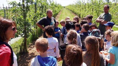 Des actions de sensibilisation aux métiers agricoles sont menées avec des enfants du territoire. Ici, une classe de CE2 de Palaiseau (91), venue en juin 2015 découvrir un verger de l'EARL Mascetti, à Marcoussis (91). PHOTO : CHRISTEL STACCHETTI