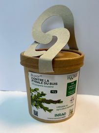 L’insecte POL (pour prédateur d’œufs et de larves) est devenu le Buxor, pour lequel Iftech détient des droits de licence exclusive mondiale avec l’Inrae et a reçu un Innovert au Salon du végétal 2022 (en vidéo ici). Des larves vivantes de chrysope de stade L2 sont introduites dès les premiers pics de vols du papillon ravageur au plus près des foyers infestés. Le seau de 150 larves (pour 1 à 2 m3 de buis) convient pour un accrochage aux endroits stratégiques dans les topiaires car les larves se dispersent rapidement après l’ouverture. On peut aussi saupoudrer la cosse de sarrasin (support des larves) sur les plantes comme avec le seau de 2 500 larves (pour 40 m3). La dispersion avec Pulzor, un équipement autoporté de la même société et dont une version à moteur électrique est sortie cette année, serait envisageable.