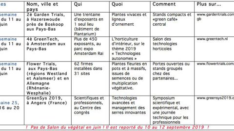 Le 4e salon GreenTech, est devenu annuel et tient son créneau en juin. Il y sera notamment question de robotique, de solutions avancées voire futuristes, de « big data » pour la gestion des facteurs climatiques… Les nouveautés primées seront annoncées le mardi 11 juin. En 2018, le salon avait rassemblé 10 465 visiteurs de 112 pays.