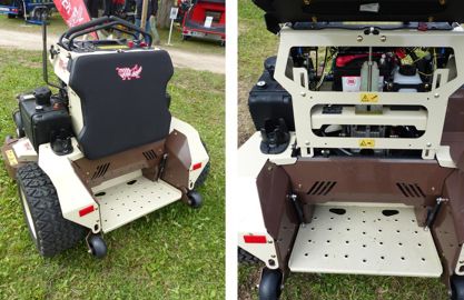 L’équipe de la nouvelle société Grasshopper France (1) a présenté une évolution de la gamme des tondeuses américaines, avec l’introduction du modèle Stand-On Series 52. La machine, motorisée par un bicylindre en « V » Briggs & Stratton Vanguard de 810 cm3(puissance de 26 ch), reçoit un plateau de coupe DuraMax de 132 cm à trois lames autorisant une hauteur de travail de 2,5 à 14 cm (kit mulching en option). La transmission est assurée par des pompes Parker et un système de refroidissement.