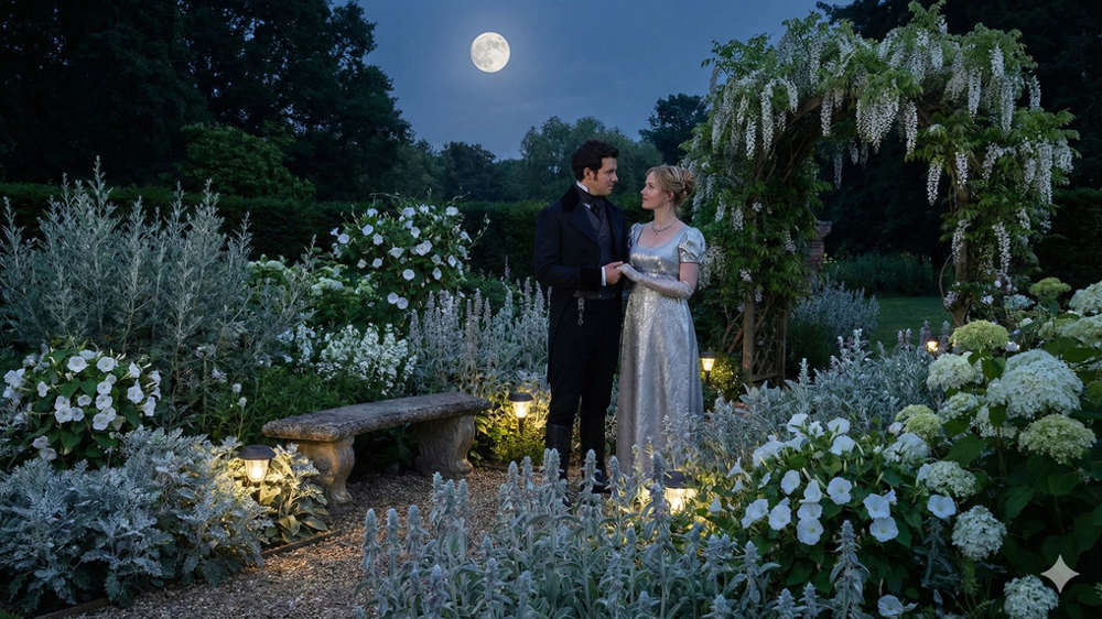 La première tendance structurante qui émerge de cette saison est sans conteste l'avènement du "Moon Garden" ou jardin de nuit. Portée par l'intrigue centrale du bal masqué, cette esthétique invite à concevoir des espaces extérieurs destinés à être vécus après le crépuscule. Pour les producteurs et les chefs de rayon, c’est une opportunité stratégique de valoriser l’éclairage de jardin ainsi qu’une palette végétale souvent sous-estimée, axée sur les feuillages argentés tels que les armoises, cinéraires ou Stachys byzantina, ainsi que les floraisons blanches luminescentes comme celles d’Ipomoea alba.