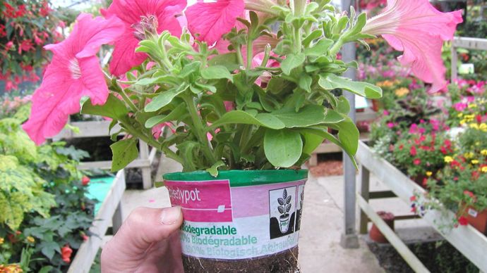 Un fournisseur allemand, Pottburri, a récemment lancé un pot réalisé à partir de coques de tournesol. Ce produit est soumis à des tests par Astredhor dans l’est de la France, comme d’autres innovations du marché, par exemple le Netpot de Bachmann, récompensé lors du concours de l’innovation du dernier Sival. Il s’agit d’un filet thermoformé en pot de culture, composé de polypropylène, donc un plastique. Mais celui-ci se dégrade, selon le fournisseur, en carbone dans le compost, même domestique. L’incorporation dans la matière d’une molécule le décomposerait en huit mois.