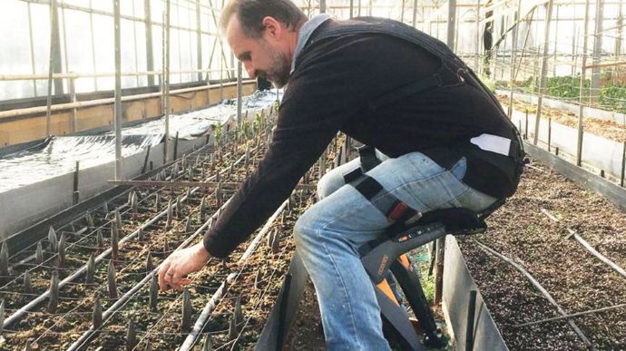 - IP14, une chaise exosquelette pour alternance de posture assis-debout. « On a testé ce dernier modèle parce qu’on est courbé pour une grande partie des activités en horticulture, précise Laurent Ronco, directeur du Scradh. Pour certaines tâches répétitives, comme l’emballage ou le désherbage dans des bacs, c’est un atout considérable. Mais il n’est pas adapté à toutes les tâches et il y a quelques freins. » Notamment, la réticence d’une partie du personnel à l’utiliser, et surtout le prix. La station d’expérimentation l’avait acheté 5 000 euros. Difficile à rentabiliser pour les entreprises de petite taille.