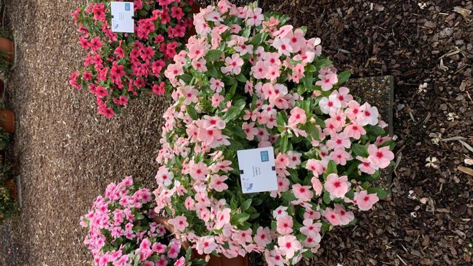 | Catharanthus roseus ‘Mediterranean’ XP Strawberry | Une nouvelle pervenche à grandes fleurs. Port retombant permettant la culture en suspensions. Magnifique en septembre à Angers. | GV |