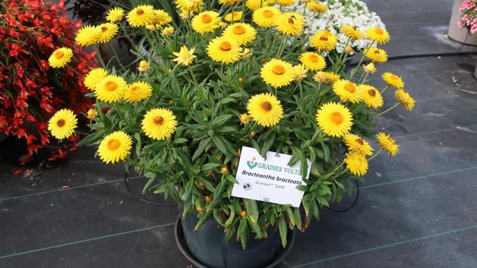 | Bracteantha bracteata GranviaTM Gold | Belles potées compactes garnies de grosses fleurs à cœur orangé plus ou moins foncé. Immortelle deux fois plus grande qu’un Bracteantha standard et très florifère. Arrivée deuxième au top 5 des essais de nouveautés. Choix des professionnels d’Astredhor Sud-Ouest (fournisseur Graines Voltz). | ASO et GV |
