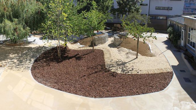 Grâce à une démarche de ce type, le groupe scolaire Maryse-Hilsz, dans le 20e arrondissement de Paris, est passé de 17 % de sol perméable à 56 % à la fin du projet. La stratégie adoptée a été de multiplier les types de sols et de matériaux pour varier les usages. « Cela permet d’apporter aux enfants des bienfaits adaptés à leurs jeux, à leur motricité : des gravillons en maternelle, du sable, des copeaux (mulch ou écorces, copeaux amortissants sous les aires de jeux) ailleurs. Des pavés enherbés ont pris place dans la zone de jardinage de la maternelle, une grave enherbée dans l’espace jardin des élémentaires. Beaucoup de végétaux ont été plantés, avec des réussites et des ratés, mais, dans l’ensemble, la végétation s’est plutôt bien développée, avec peu d’entretien. Nous avons réussi à retrouver la terre vivante souhaitée au départ. Grâce à toutes ces zones perméables, l’eau peut s’infiltrer, permettant à la végétation de s’autoentretenir en quelques années. De plus, l’eau des zones imperméables est collectée puis dirigée dans des drains qui passent sous les surfaces végétalisées. La cour est donc à 100 % déconnectée des réseaux. »