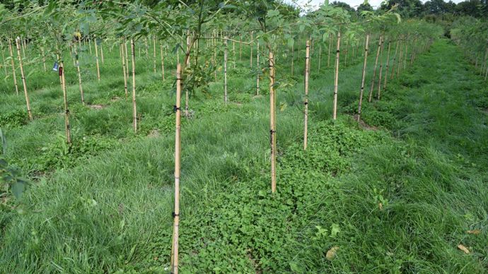 Il y a deux ans, il a donc décidé de semer – à la volée –, dans une parcelle de 2 ha de porte-greffes de rosiers, un trèfle blanc sur le rang. Le chantier a été réalisé après la pose des tuteurs. « J’ai travaillé sur un sol très propre et semé à 50 kg/ha. C’était volontairement surdosé pour être sûr de contrôler les adventices. » Afin de comparer, le pépiniériste a laissé un rang témoin sur lequel il a, cette année, réalisé trois passages de désherbant. « Dans cette démarche de réduction des phytos, une idée en appelle une autre. L’important est d’y aller progressivement, d’expérimenter et de se faire confiance », résume Florian Dauguet.