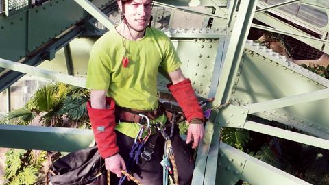 Un élagueur du CFPPAH de Saint-Germain-en-Laye (78) a mis en place avec précaution le système d'ancrage aux poutres dans la grande serre des forêts tropicales au Muséum d'histoire naturelle, à Paris. PHOTO : C. AMBIEHL