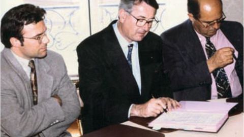2. Le 28 décembre 1994, signature dans le cabinet de Nicolas Sarkozy, à l'époque ministre du Budget, de l'accord de retour de la TVA à 5,5% sur les produits horticoles. Alain Torrelli (à droite), alors président de l'Unep (Union nationale des entrepreneurs du paysage), et Bernard Pical (au centre) signent cet accord en présence du délégué au commerce.