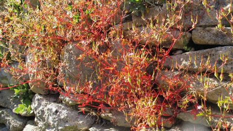 Lierre et géranium Herbe à Robert poussant librement dans des murs de pierre sèche prouvent que le végétal peut être facile...
