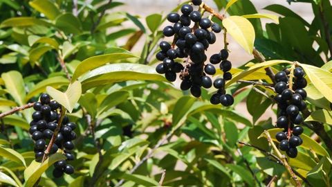Laurier-cerise (Prunus laurocerasus), rosacées.La consommation de ses fruits noirs provoquede légers troubles digestifs. PHOTO : JÉRÔME JULLIEN