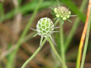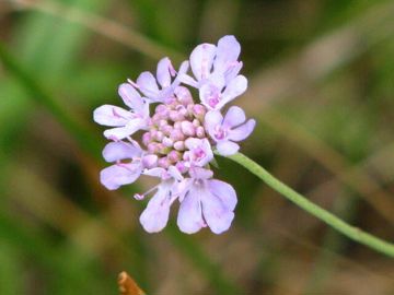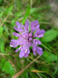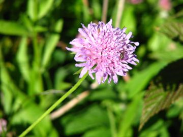 La knautie des champs (Knautia arvensis) vit dans les prairies et pelouses. Son inflorescence est de couleur assez variable, bleutée à lilas. Les feuilles de la tige sont découpées en segments.