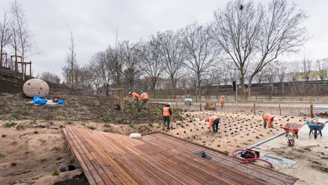 La majeure partie des travaux d’implantation s’est déroulée en 2023 pour s’achever fin mars 2024. Si la réception des végétaux a été réalisée par Urban-Eco, l’implantation a été assurée par des paysagistes (Agence Ter pour le Village olympique, et D’ici Là pour le Cluster des médias). « Ces entreprises n’étaient pas celles qui garantissaient le végétal, une disposition rare qui imposait une collaboration basée sur la confiance face aux sols et végétaux imposés, souligne Henri Specht. Cela n’a pas toujours été simple. De nombreuses garanties ont parfois été exigées de leur part. »