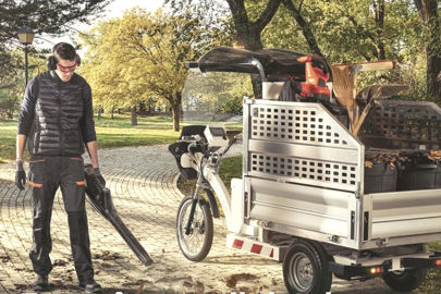 Voilà un tricycle, le Freegônes de marque Kleuster, qui détonne dans le paysage ! La moitié avant rappelle un vélo classique quand la moitié arrière se veut être un châssis porte-équipement. La roue avant (de vélo) est dotée d’un frein à disque, et les roues arrière (d’utilitaire) sont équipées de freins à disques hydrauliques.